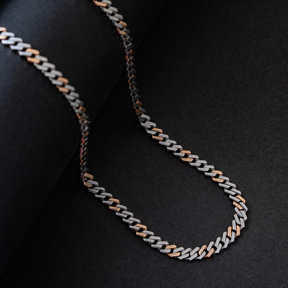 Elevate your style with this Dual Edge Link Chain, featuring a striking blend of silver and rose-gold toned links. The precision-cut design creates a smooth, fluid flow that reflects light with understated brilliance. Its balanced two-tone finish offers versatility, making it easy to pair with both casual and formal outfits. Crafted for comfort and durability, this chain is perfect for everyday wear while adding a refined, contemporary edge to your look.