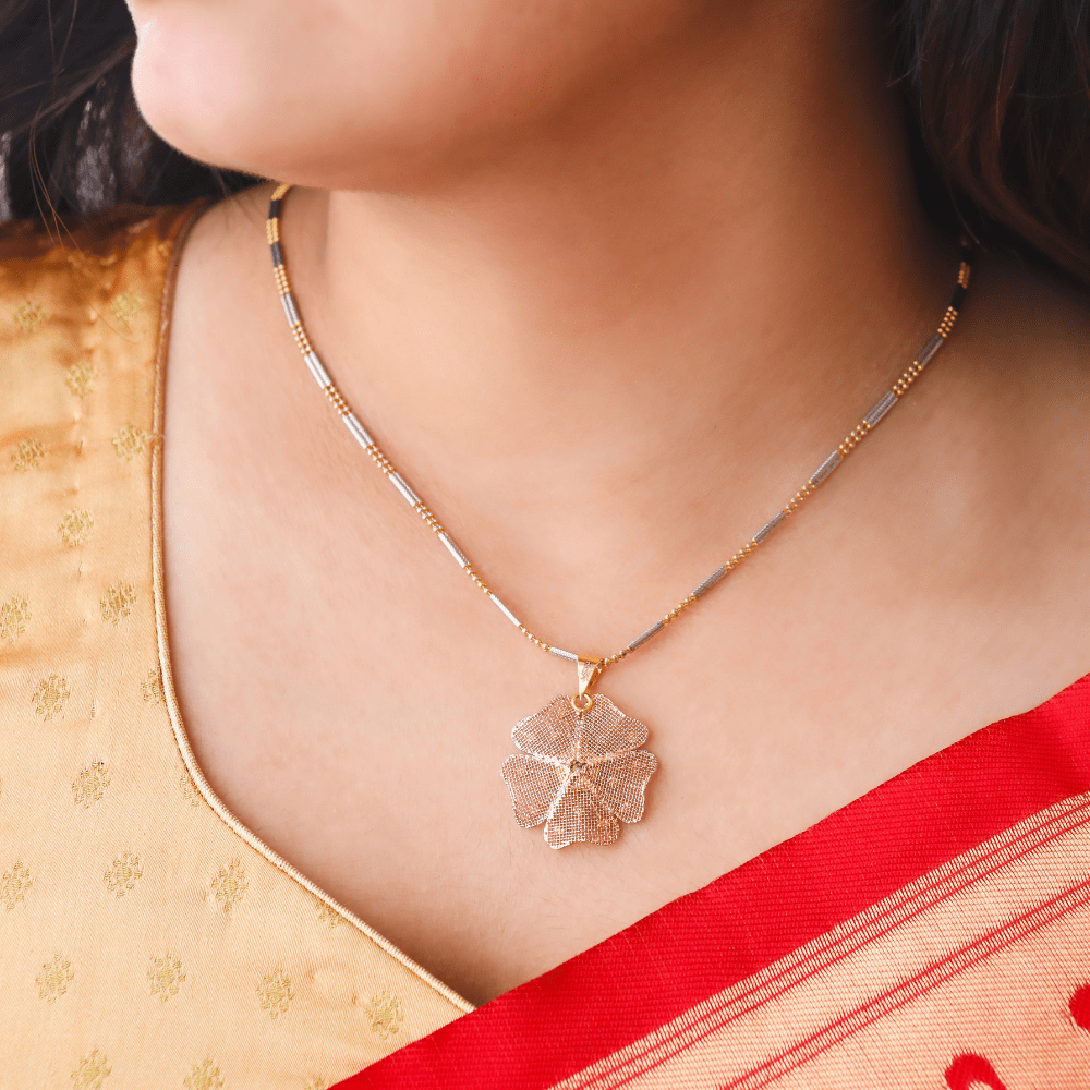 This exquisite pendant set features a beautiful four-petal floral design crafted with precision in a soft rose gold finish. The delicate meshwork adds texture and dimension, making it a captivating accessory for both casual and traditional wear. The matching floral stud earrings complement the pendant, creating a harmonious look. Ideal for festive celebrations or adding charm to everyday outfits.