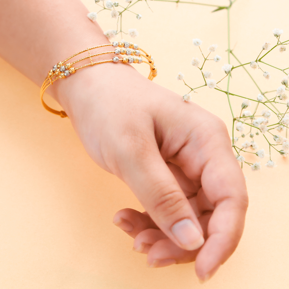 This multi-layered bracelet with intricate golden and silver beads brings a stylish twist to classic designs. Ideal for girls who love layering their accessories for a fashionable, standout look.