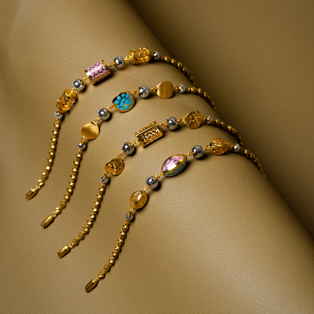 These bracelets blend rich gold tones with vibrant enamel beads, creating a striking balance of color and craftsmanship. Each piece features a series of sculpted elements, from filigree motifs to polished forms, connected by sparkling silver-accented spheres that add a hint of brilliance. The alternating textures give the bracelets a rhythmic flow, making them comfortable to wear and captivating to look at. Ideal for daily elegance or festive layering, they bring character and refinement to any wrist.