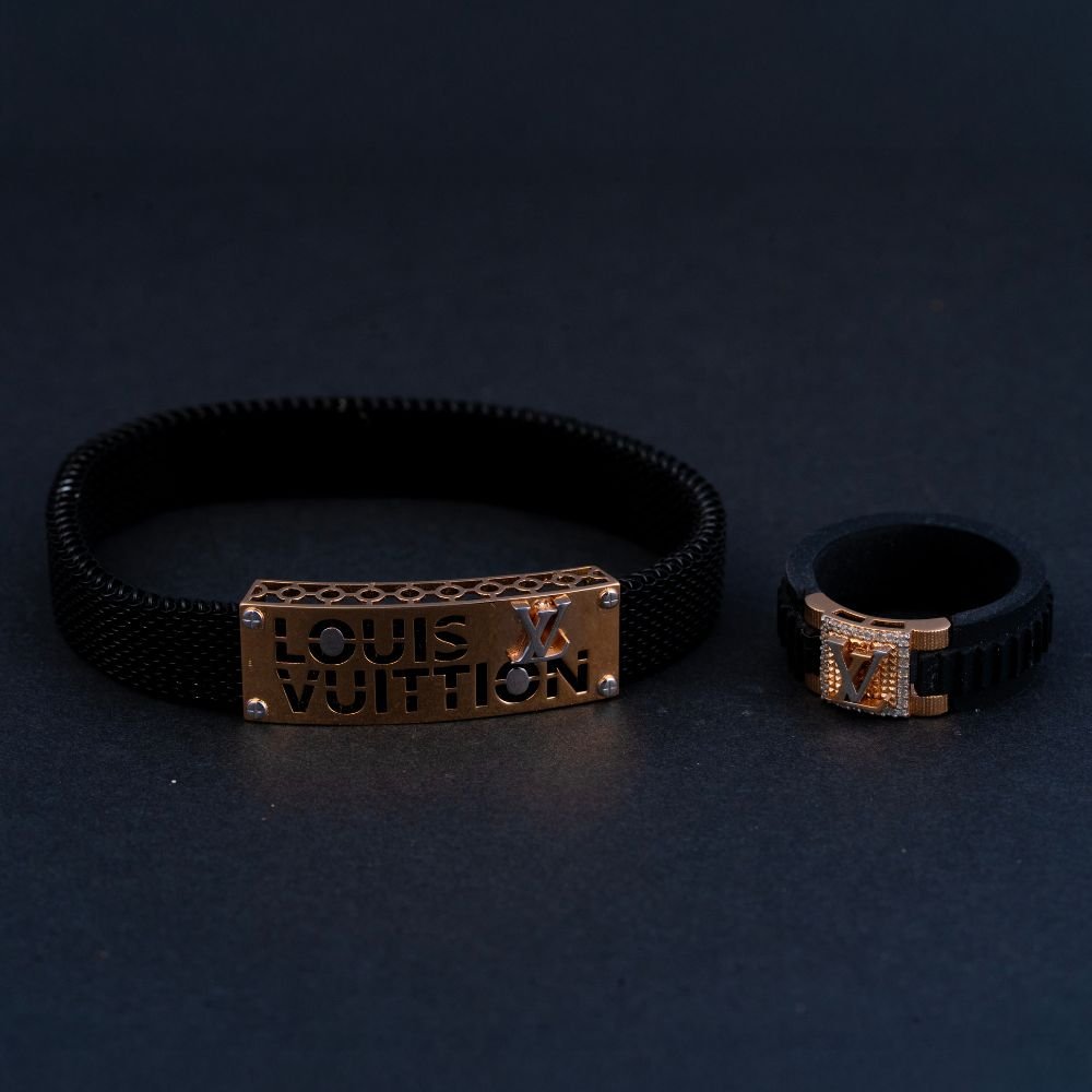 Make a bold fashion statement with the LV Black Luxe Mesh Bracelet — a perfect blend of sophistication and modern design. Crafted with a sleek black textured band, it features a gleaming gold-tone LV emblem plate that exudes luxury and confidence. The refined contrast of matte black and polished gold creates a timeless appeal, making it an ideal accessory for men who appreciate understated elegance with a designer edge.